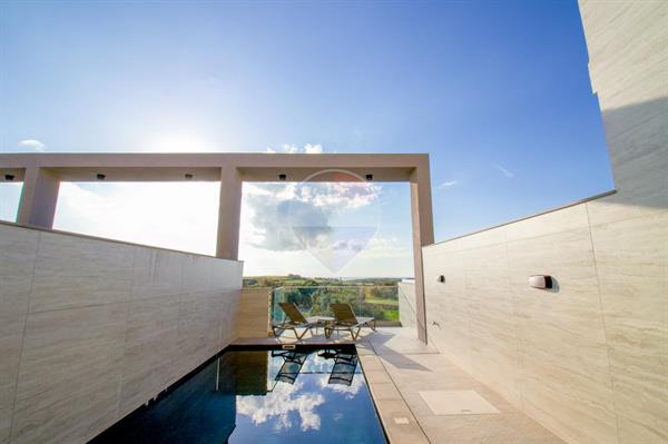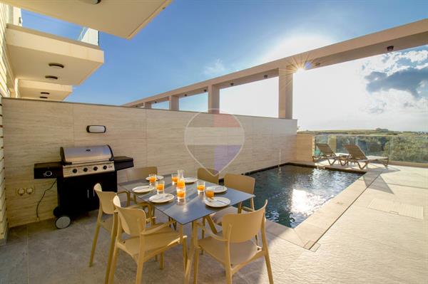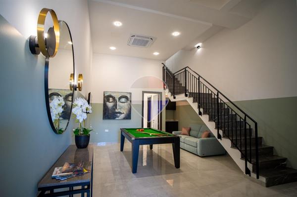 Situated on the tranquil outskirts of GHARB, this stunning three-bedroom modern TERRACED HOUSE forms part of a brand-new, exclusive development finished to the highest standards. Designed for contemporary living, the home enjoys panoramic countryside views and exudes style and comfort throughout. Spread over three levels, the property welcomes you with a private carport leading into a beautifully designed ground floor featuring a living area, kitchenette, games room, and a bedroom with en-suite. A marble staircase leads to the first floor, where a bright and spacious open-plan kitchen, dining, and living area opens onto a large terrace with a full-sized pool, sun deck, and BBQ area — perfect for entertaining while taking in the breath-taking views. A guest toilet completes this level. The top floor includes two additional bedrooms, both with private en-suites, offering comfort and privacy.