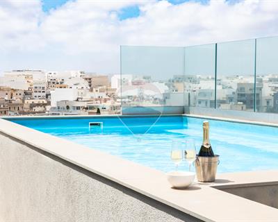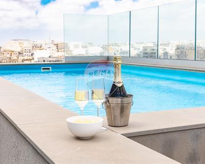 ST. JULIAN'S - A luxuriously finished duplex penthouse, enjoying a large a terrace with a private swimming pool/jacuzzi, situated close to the heart of this town. Layout is in the form of an open plan living/dining, a kitchen, a guest toilet room and two double bedrooms (main with with an en-suite). It is modernly furnished and fully equipped with modern day gadgets. Must be seen!
