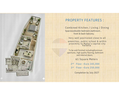 Pieta - Apartment forming part of a new block which is currently on plan with completion by March 2027. Property consists of an open plan kitchen/living/dining, one bedroom, main bathroom and a balcony. Property will be sold finished excluding bathrooms and internal doors. Block served with lift. Freehold